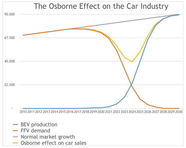 Durante un largo periodo que va desde 2019 hasta 2028, las ventas totales de automóviles caen en conjunto. Las ventas de coches de gasolina-diésel caen muy rápido y las ventas de eléctricos crecen lentamente. La suma de ambas ventas es inferior a la tendencia natural de la demanda de coches.