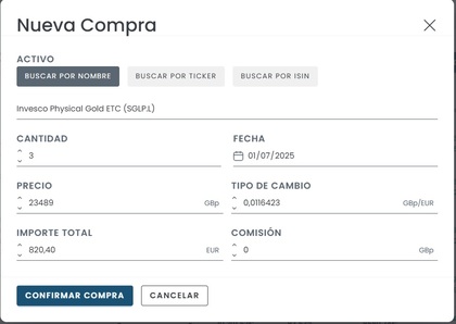 Para inaugurar tu cartera, puedes empezar comprando acciones o ETFs. En la pestaña “Posiciones”, haz clic en “Añadir posición” y busca el activo que deseas adquirir -por ejemplo, el ETF de oro Invesco Physical Gold-