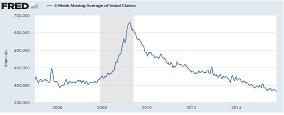 Si nos centramos en los mercados, no atisbamos una señal alarmante de cambio de tendencia, si bien cierta desaceleración. Los indicadores adelantados no cruzan a la baja el umbral 50 y en Estados Unidos, un indicador muy correlacionado con la bolsa, las peticiones de desempleo continúan cayendo después del máximo de 2009. De la misma manera, el gap que podemos ver el gráfico 2 entre el ISM manufacturero y no manufacturero se debe principalmente a las compañías relacionadas con las materias primas ralentizando el sector industrial.