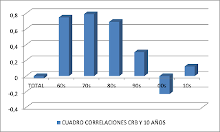 Profundizando un poco más, podemos comprobar que esta correlación desapareció incluso antes. Si bien en los 60 y en los 70 todos los componentes del índice CRB mostraban una correlación significativa con el bono a 10 años, en los 80 tan solo el componente de energía y el de alimentos seguían con correlaciones superiores al 50%.