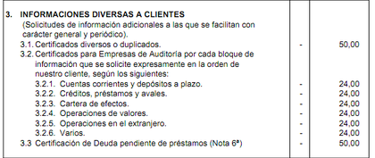 El caso es que ahora veo que me han cobrado 59 € de comisión por "expedición de duplicados y extractos", que supongo que será por la expedición de ese certificado. Voy a ir a la sucursal a que me expiquen esa comisión y quiero ir sabiendo lo que puedo hacer en cada caso. Por eso ¿veis normal el importe de dicha comisión? supongo que las comisiones están establecidas en algun "libro de comisiones" o algo así (lo he buscado por internet pero no la he encontrado) ¿está obligado el empleado a enseñarme exactamente dónde está recogida esa comisión? supongo que sí. En caso de que no esté recogida esta comisión o el importe de la misma no sea el que me ha cobrado ¿qué haríais? ¿reclamaríais en la propia sucursal o haríais un escrito para mandar posteriormente al Servicio de Atención al Cliente?