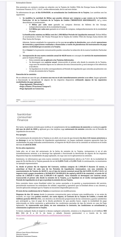 No obstante, en mi correo particular si que me enviaron las nuevas condiciones y en Bankintercard atención al cliente también, por lo que no tuve ninguna duda de que existiera error de interpretación, así que adios visa Air Europa. Ahora habrá que ver si tienen demasiadas bajas y lo reconsideran o por el contrario quedan tan satisfechos con la "limpia" que sacan una nueva tarjeta o similar con las condiciones actuales.