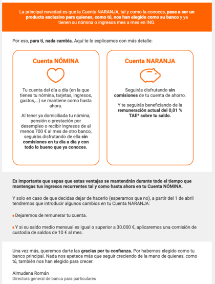 Hola, me ha llegado la noticia de que ING va a empezar a cobrar comisiones a partir de abril, concretamente a quien tenga cuenta naranja con más de 30.000€ y no tenga nómina, la cantidad de 10€ mensuales. O algo así...., Mi pregunta es : Si la cuenta naranja estoy yo de titular y mi mujer de cotitular, con mi nómina en la cuenta nómina, estaría excento de esa comisión ? O ella también tendría que tener su nómina domiciliada en ING ?