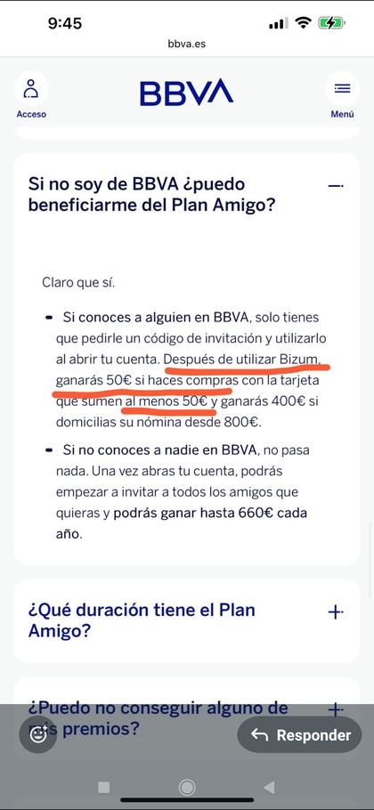 Gracias por responder.... parece q sí, q tengo un poco de lío.... a ver, me refiero a que, si alguien se da de alta con mi código amigo, ahora uno de los requisitos para cobrar la promoción (400 euros por domiciliar nómina y 50 euros por utilizar por primera vez la tarjeta con un mínimo de gasto de 50 euros) es utilizar Bizum, según las bases, pero yo me di de alta en junio con código amigo y en ningún lado ponía lo del bizum....