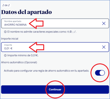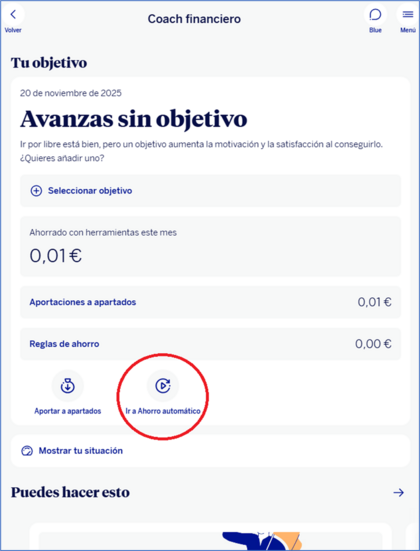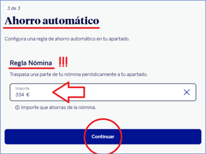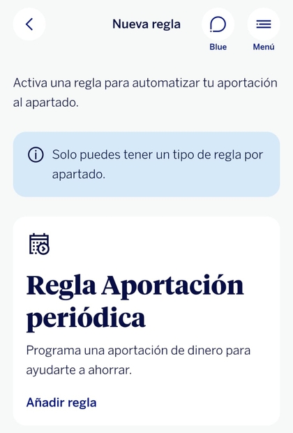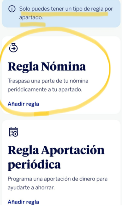 En el apartado me aparece “ahorro automático – regla aportación periódica”, pero no me dice nada de la nómina. Entonces no sé si lo he hecho mal o qué, cómo va esto. Lo que sí me parece un rollazo es esta app y cómo navegar con los apartados estos.