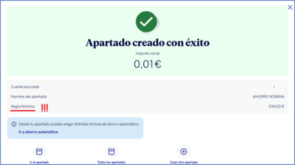 Yo no entiendo nada. Abrí un apartado y creé una regla de aportación periódica con la nómina. La nómina entró el día 20 de octubre y el traspaso automático al apartado se hizo el 27, y por ahora no he cobrado nada. No veo por ningún lado lo de “regla ahorro nómina” con la pestañita activada que algunos ponen por aquí; solo en Mis promociones veo la promo activada.