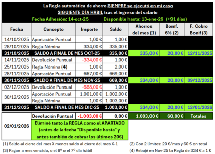 Comentar mi caso, con fechas y movimientos reales. Decidí jugármela, asumiendo riesgos de que podrían no pagarme los últimos 20 euros por cancelar/eliminar tanto la Regla como el Apartado antes de la fecha "Disponible hasta" y antes también de que pagasen los 20 € este mes a quienes les correspondiesen. Como ya tenía montada la tabla con movimientos del Apartado, aquí mi caso: Pues eso, que pensaba podrían no pagarme el 12-ene los últimos 20 euros por haberme cargado tanto la Regla como el Apartado antes de llegada esa fecha, pero los recibí. También tiene su lógica, a mi parecer, que tuviera derecho puesto que ya eran hechos consumados que había ahorrado 335+334+334 en tres meses consecutivos, pues ya había hecho los 'deberes' antes de que se iniciase el año 26.