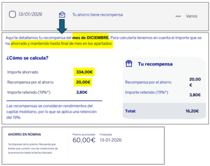 Por otro lado, consultando documento en el buzón, que ha llegado hoy, reconoce la entidad que en diciembre ahorre esos 334 y por tanto me correspondía la bonificación: