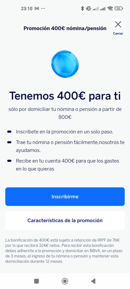Me adherí a la campaña 760, a los pocos días a la de 400 euros y he cobrado, soy funcionaria pero por lo leído al parecer no se fijan, espero que bvva siga con promociones, pillarlas y así durante años ☺️
