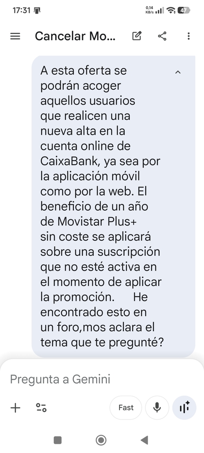 Tengo una duda importante sobre la promoción de un año de Movistar Plus+ con la Cuenta Online de CaixaBank. He cumplido los requisitos de los 3 pagos y el Bizum, pero me encuentro con una contradicción en las normas: