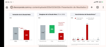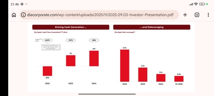 Siempre me gusta seguir unos parámetros que son los que me van guiando para seguir en esta empresa .....el dinero que entra y sale en la empresa ,lo que se gasta e invierte en su negocio y su deuda respecto a lo que genera.....saquen sus conclusiones los que lleváis tiempo diciendo que está empresa estaba metida en un foso y nunca saldría....mientras año tras año iba mejorando en estos parámetros ,siempre dije que esa evolución llevaría muy pronto a los beneficios reales pues ya llegaron y seguirán creciendo al ritmo de generación de flujo de caja y beneficio no descarto que en no mucho tiempo sea una empresa con deuda 0,¿Cuanto valdría DIA sin deuda generando un beneficio de 275 millones un mayor ebitda de lo declarado este año (300 millones) y el patrimonio inmobiliario en tiendas de su propiedad ?