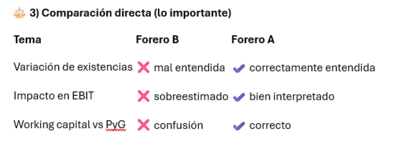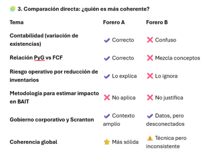 🧩 3. Comparación directa: ¿quién es más coherente? | Tema | Forero A | Forero B | Contabilidad (variación de existencias) | ✔️ Correcto | ❌ Confuso | Relación PyG vs FCF | ✔️ Correcto | ❌ Mezcla conceptos | Riesgo operativo por reducción de inventarios | ✔️ Lo explica | ❌ Lo ignora | Metodología para estimar impacto en BAIT | ❌ No aplica | ❌ No justifica | Gobierno corporativo y Scranton | ✔️ Contexto amplio | ✔️ Datos, pero desconectados | Coherencia global | ⭐ Más sólida | ⚠️ Técnica pero inconsistente👉 Conclusión: El forero A es claramente más coherente y técnicamente preciso. El forero B intenta construir un modelo de eficiencia, pero sus cifras no están justificadas y mezcla conceptos contables. 🧩 4. En el contexto de Grifols, ¿quién está más alineado con la realidad?✔️ La visión de A encaja mejor con la situación real de Grifols
