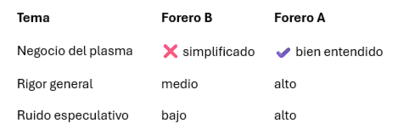 🧩 5. Conclusión finalEl forero A muestra un entendimiento más profundo, coherente y contextualizado de Grifols. Su análisis contable es correcto, su visión estratégica es más completa y sus objeciones a B son pertinentes. El forero B aporta datos y conceptos válidos, pero su argumentación es inconsistente, especialmente en: