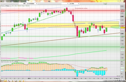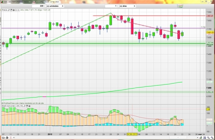 Entonces en semanal, para el medio-largo plazo, tiene lecturas interesantes de los verdes. Aparece por debajo de cero en caídas muy pronunciadas en poco tiempo. Cuando desaparece de nuevo al llegar otra vez al cero da una entrada bastante fiable (aunque pocas). Y otra lectura clara es cuando aparece por arriba, encima del marrón; cuando hace máximos es el mejor momento de venta. Esto confirma sobre un gráfico que el pardillo entra el último y sale el primero cuando arrean fuerte.