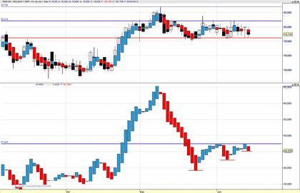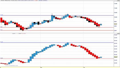 Añado a la gráfica de precios el indicador de color, y con la misma relación de azul-vela blanca, rojo-vela negra, y añado la esperanza de que efectivamente sea así pues, mientras más blanco sobre azul sea la vela de precios más esperanza tendre de que la próxima vela de precios sea alcista, y mientras más negro sobre rojo sea la vela de precios, más esperanza tendré de que la proxima vela de precios sea bajista.