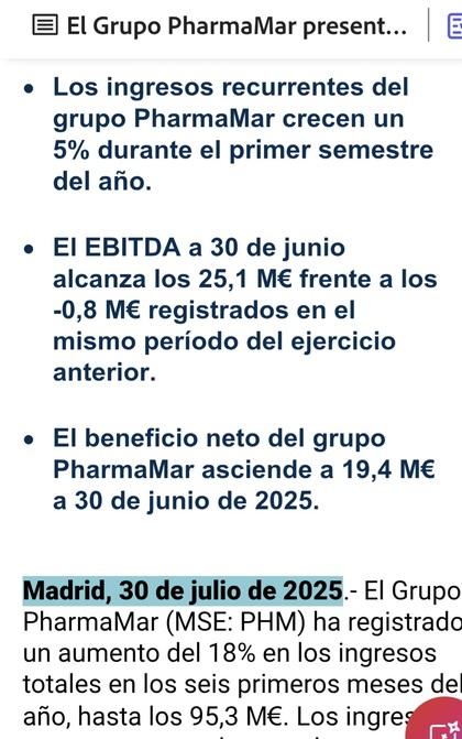 Primer semestre 2025 PharmaMar registró un saldo de caja y equivalentes de 128,9 M€, con una deuda financiera total de 48,3 M€. Caja Neta +80Mll.