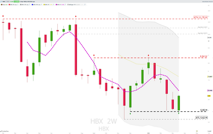 STLAM , mensual, la tengo pintada en seguimiento de reojo como tantas otras pero en estos momentos y con todos los frentes que tengo abiertos no me interesa ni lo mas mínimo ... Pero hay que decir que esta en un nivel muy interesante, la verdad ... en plan do or die ... recupera o muere ( un poco mas si cabe ) HBX 2-semanas Y esta pájara en cuanto me de oportunidad la liquido, tampoco me interesa, es el único stock que tengo que mirar a las mañanas y no quiero. Me da igual a donde se vaya, tiene muy poco histórico y mis indicadores de medio plazo no son útiles, paso. A ver si se acerca a 7 y cierro la posición sin daño y para una cena.