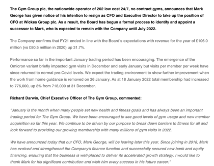 The Gym Group, the nationwide operator of 206 low cost, high quality, 24/7 no contract gyms, is pleased to announce the appointment of Luke Tait as Chief Financial Officer ("CFO") and Executive Director of the Company. Luke is expected to start in October 2022 and will join the Board of Directors of the Company.