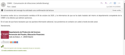 En vuestras manos queda hacer valer vuestros derechos y defender vuestros intereses. Por mi parte, lo tengo claro: cuantos más seamos, más presión ejercemos a la CNMV para que actúe, porque la CNMV valora el daño del inversor; si solo un inversor se queja, no hay magnitud del daño.