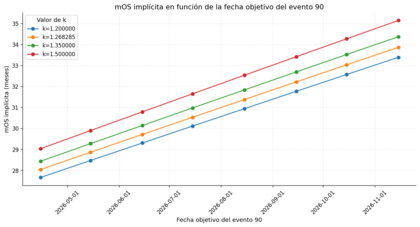 Quiero estimar qué mediana de supervivencia global (mOS) es compatible con distintas fechas calendario en las que ocurre el evento 90.