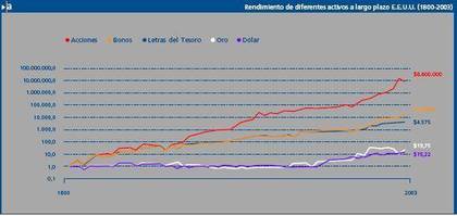 Desde 1871 a 1992 y a pesar de todas las quiebras, recesiones y crisis, las acciones batieron a los bonos en el 80% de los periodos de 10 años y en el 100% de los periodos de 30 años. Además, la renta variable ha resultado treinta veces más rentable que los bonos del estado. La explicación reside en que al comprar acciones se está adquiriendo una parte de un negocio y por lo tanto se está de parte de su crecimiento y expansión. "El inversor de bonos es tan sólo la fuente de dinero más próxima y lo máximo a lo que puede aspirar es a recuperarlo con intereses".