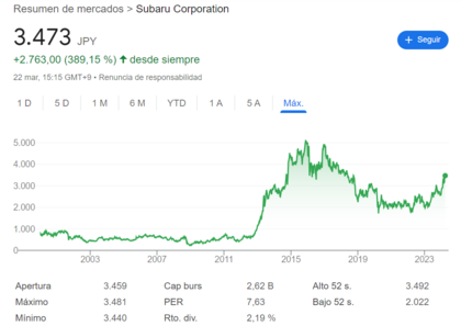 Subaru ha casi duplicado (+92,1%) su beneficio atribuible, hasta los 385.100 millones de yenes (2.280,9 millones de euros) al cierre de su año fiscal 2024 (concluido el pasado marzo), respecto a los 200.400 millones de yenes (1.186,9 millones de euros) que reportó en el ejercicio anterior, según se refleja en sus resultados.