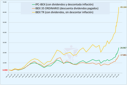 Una vez descontada la inflación y sumados los dividendos, la revalorización en términos reales de nuestro índice IPC-iBEX es de un increíble 53,3%, pasando de los 15.895 puntos a los 24.363.