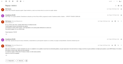 #uprofit Buenas tardes, vengo a comunicarles mi muy mala experiencia, con la empresa de fondeo de futuros, uprofit. Comento rapidamente mi devastadora situacion con la empresa. Yo hace 11 meses compre el challengue de las cuentas zero. Al mes pase la prueba, pague mi fee, y luego por redes empezaron los problemas de que no pagaban y la empresa entro en una decadencia total, hace 7 meses atras aproximadamente consulte via soporte si estaban pagando y si iban a pasarme a sus nuevas cuentas DAY, ya que las zero habian sido discontinuadas y solo los usarios que las manteniamos podiamos seguir operando sin problema, eso me relajo. Luego de 11 meses trabajando con ellos, llego el 17-09-2025 mi PRIMER retiro Como trader, y en esta empresa. -Cosas que note raro: al momento de solicitar el retiro, automáticamente me hace logout y me pide un cambio de contraseña Contacto a soporte, donde me daban respuestas muy genéricas sin resolverme nada.