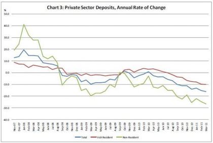 Para cuando llega a los periódicos, lleva ya sucediendo meses. Yo hace meses que he leído que no solo los bancos griegos están sufriendo una disminución de depósitos drástica, sino también los irlandeses. Te pongo una gráfica al respecto. Los depósitos extranjeros son los primeros que empiezan a marcharse hacia octubre del 2009, y son los que están abandonando el país en manadas. El efecto alcanza a los nacionales irlandeses a partir de julio de 2010, que con la crisis soberana empiezan a retirar dinero de los bancos irlandeses. Desde entonces la salida no ha hecho sino acelerarse, hasta el punto de que en marzo el banco central irlandés ha manifestado una salida de 2 billones de € de los depósitos bancarios irlandeses en ese mes.