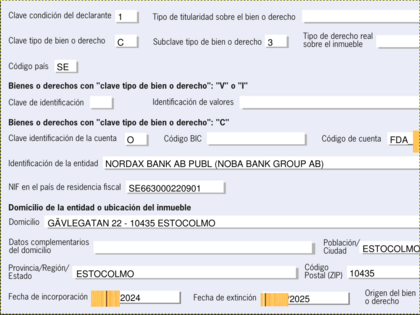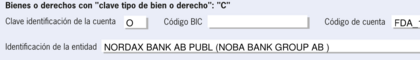 Muchas gracias. - La dirección de los bancos nunca puse ningunade ningún banco. Sólo el 2º código del país que es obligatorio. - En mar2025 cuando abrí el depo, ya era Noba. En el 720 se ponen los datos a 31dic2025 así que en Identificación de la de la entidad dejaré Noba. - Sobre el 1º código del país es mi mayor duda. Si en la info fiscal de Raisin me viniese un IBAN de Finlandia pues pondría FI. Si es sueco pues SE.
