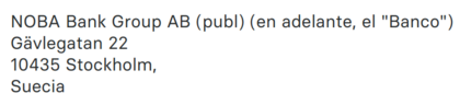 La sede social de Nordax Bank antes y de Noba Bank ahora está en Suecia, el contrato de los depósitos, todo está en Suecia. No hay referencia a Finlandia.