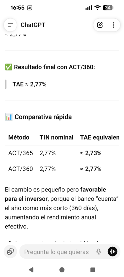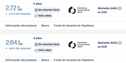 En la información del producto del depósito a dos años de Haitong se dice que el TIN y el TAE son 2,77%. Creo que es un error. En un depósito de más de un año con cobro de intereses al final, el TIN siempre es superior al TAE. Lo he consultado a Raisin y me afirman y reafirman que la información de su web está correcta, que TIN y TAE en este caso coinciden porqué no hay capitalización de los intereses. Yo les he dicho que solo pueden coincidir cuando el depósito es por el plazo de un año. Pero la agente que me ha atendido insiste en lo contrario. ¿Algún experto puede confirmar si la información de este depósito de Haitong a dos años es correcta? Gracias.