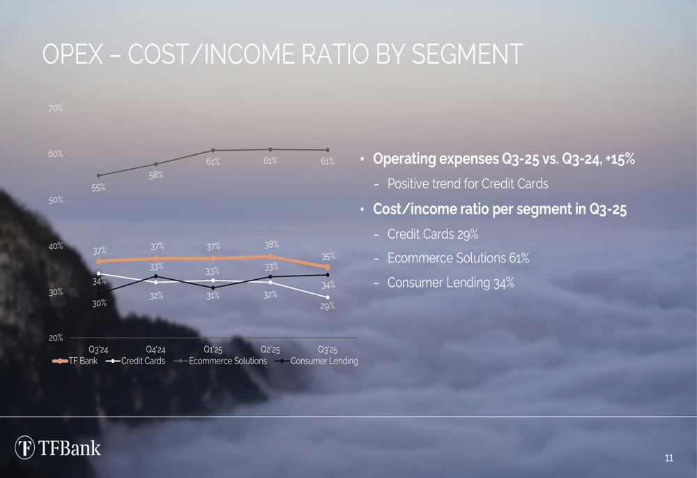 El segmento de Soluciones de Comercio Electrónico, aunque más pequeño con un 11% de la cartera de préstamos de TF Bank y un 17% de los ingresos operativos, experimentó un crecimiento significativo del volumen de transacciones del 51% en comparación con el tercer trimestre de 2024.