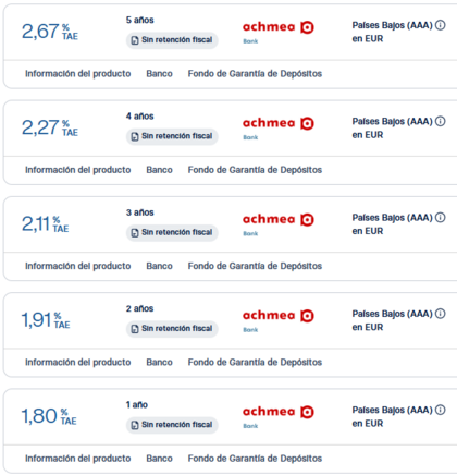 Nuevo banco en Raisin de Paises Bajos, Achmea, con 10 nuevos depósitos de 1 a 10 años.
