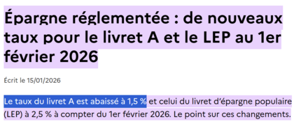 Los tipos en Livret A se revisan semestralmente. Desde el 01-feb-26 el TIN se redujo al 1,50%: