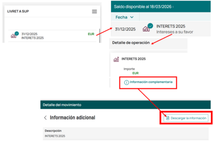 Lo que hice fue acceder a los movimientos en la Livret A para descargar el justificante del movimiento con los intereses del año 2025. Lo hice por web, siguiendo este camino: