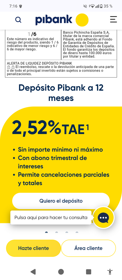 Pibank – depósito (cancelable) al 2,02% a 1 año. Sin importe mínimo. Pibank es una marca comercial de Banco Pichincha siendo un mismo banco. (https://www.pibank.es/deposito-bancario-plazo-fijo/)