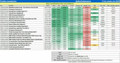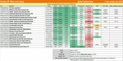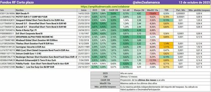 Actualización de septiembre de tablas de monetarios, RF ultra c/p y RF c/p. Como novedad añado el Evli Euro Liquidity (FI0008804463) a los de ultra c/p. Además ordeno las tablas por CAGR proyectado