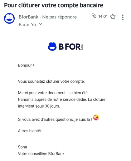 En este sentido, por otra persona, que también envió formulario de rescisión, pero se ve que tampoco le hicieron p**** caso, ha recibido esta semana, miércoles 15-oct, este 'maravilloso' email, asunto acabado en "votre carte BforBasic devient gratuite sous condition" que incluye tooooda una deferencia de la entidad hacia la destinataria advertida 😨