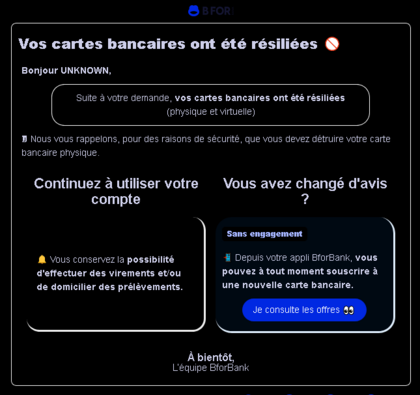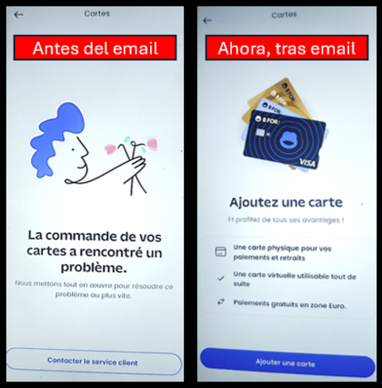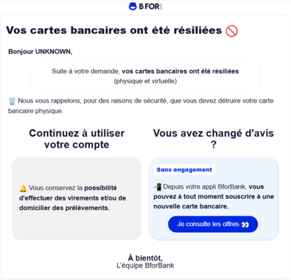 El email que me llegó hoy, procede de la misma cuenta de correo a la que había enviado el primer formulario, que es vieducompte(arova)client.bforbank.com, y al responderles con el nuevo formulario y mi pataleta (sin perder demasiado las formas) en el cuerpo del mensaje, puse Con Copia el email que habíamos utilizado como último recurso cuando los desaguisados con las múltiples cancelaciones de las tarjetas, service(arova)client.bforbank.com, para que al menos estén al tanto desde ya.