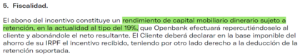 - Imagin 50-75€ amigo: Retiene, intereses. - Openbank 60€ promo x300x6m: Retiene, intereses. - MyInvestor 20-25€ amigo: Retiene, intereses. - N26 15€ bienvenida y 20€ amigo: No retiene, ganancia patrimonial. - Raisin 50€ amigo y 25€ promo primavera: No retiene por extranjero, intereses. - Bfor 80€: No retiene por extranjero, pensaba que intereses. Te pagan por hacer uso de la cuenta, por transferencias de capital, serían rendimientos del capital mobiliario, o eso creo. @charly17