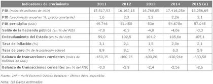 Contexto económico Coyuntura económica Estados Unidos tiene la principal economía del mundo. Sin embargo, el país ha conocido su mayor recesión desde los años 1930, como consecuencia de la crisis financiera de 2009. Gracias a un plan de estímulo presupuestario y monetario de largo alcance, la economía se ha recuperado. En 2014, el crecimiento económico alcanzó 2,2%. A pesar de este resultado positivo, la economía tiene variaciones importantes a lo largo del año: el crecimiento retrocedió 2,9% en el primer trimestre de 2014, y por otra parte aumentó 4,6% y 3,9% en el segundo y tercer trimestre de 2014. El crecimiento podría llegar a 3,4% en 2015 gracias a la debilidad de las tasas de interés, al dinamismo en la creación de trabajos y al bajo endeudamiento de los hogares. Después de la crisis de 2009, la Reserva Federal (Fed) inyectó una suma considerable de efectivo en la economía americana, pero anunció el término de su programa de flexibilización cuantitativa en el otoño de 2014. Paralelamente, las tasas de interés de la Fed siguen siendo bajas. No se ha previsto subirlas antes de fines de 2015. Estas tasas de interés bajas alimentan el consumo doméstico, pero corren el riesgo de crear una burbuja crediticia. Por otra parte, Obama busca estimular la recuperación económica. El presupuesto para el año fiscal 2013 entregó recursos a los sectores más críticos para asegurar el crecimiento de la economía y reequilibrar la fiscalidad. También se lanzó un plan de reducción del déficit público. Sin embargo, el envejecimiento de la población puede aumentar el gasto en salud, siendo que la reforma de la salud extendió la cobertura de seguros médicos. Según una encuesta, los americanos estiman en su mayoría que su país sigue en crisis en 2014. Consecuentemente, el partido republicano ha ganado la mayoría en el Senado y reforzado su posición en la Cámara de representantes después de las elecciones de noviembre de 2014. Sin embargo, Barack Obama ha aplicado una nueva ley de regulación financiera, que inflige numerosas multas a los bancos en 2014 –la regulación y supervisión de los mercados financieros son objetivos principales. Además, se tomaron medidas en septiembre de 2014 para luchar contra la evasión fiscal de las empresas americanas. Debieran permitir recuperar 20 mil millones de USD en recaudación fiscal en diez años. A nivel internacional, Estados Unidos afronta los conflictos en Ucrania y Medio Oriente, y la ralentización económica de sus principales socios. Además, el aumento del valor del dólar ha penalizado las exportaciones en 2014. La crisis financiera internacional ha provocado un aumento considerable del desempleo, que luego bajó a 6,1% en 2014. En 2014, 230.000 nuevos empleos fueron creados cada mes. Sin embargo, esto no permite ver una baja de la tasa de participación en el mercado laboral. Si se toman en cuenta los trabajadores desanimados que dejaron el mercado laboral y los que se ven obligados a aceptar puestos en jornada parcial, la tasa de desempleo real sube a 11,5% (contra 8-10% antes de la crisis). Además, los sueldos no aumentan lo suficiente. Las desigualdades han aumentado desde los años 1980, alcanzando actualmente su punto más elevado desde hace un siglo. En 2014, el número de ciudadanos americanos que disponían de un bien inmobiliario alcanzó su nivel más bajo desde 1995. Los hogares se vieron beneficiados por la baja del precio del petróleo a fin de año. Esto es significativo, ya que su gasto representa 70% de la actividad económica nacional.