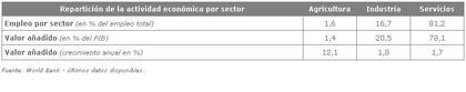 Principales sectores económicos El sector agrícola americano es, sin duda, el más importante del mundo. Se caracteriza por una alta productividad y por el uso de tecnologías modernas. Estados Unidos es uno de los principales productores de maíz, soja, carne de vacuno y algodón. El estado de California genera más de 12% de la producción agrícola total del país. Sin embargo, la agricultura representa únicamente 1,3% del PIB americano y emplea a 1,6% de la población activa. Estados Unidos es un país muy industrializado. El sector industrial representa 21% del PIB e incluye una gran variedad de actividades. Las más importantes son la fabricación de maquinaria eléctrica y electrónica, de productos químicos y maquinaria industrial, así como el sector agroalimentario y automotriz. También es líder mundial en el sector aeroespacial y en la industria farmacéutica. La abundancia de recursos naturales ha convertido al país en líder en la producción de varios minerales y le permite mantener una producción diversificada. Así, es también el mayor productor mundial de gas natural líquido, aluminio, electricidad y energía nuclear, y el tercer productor mundial de petróleo, y desde hace varios años se desarrolla la extracción a gran escala de gas de esquisto. La economía americana se basa fundamentalmente en los servicios. El sector terciario representa más de tres cuartos del PIB y emplea a 81% de la mano de obra.
