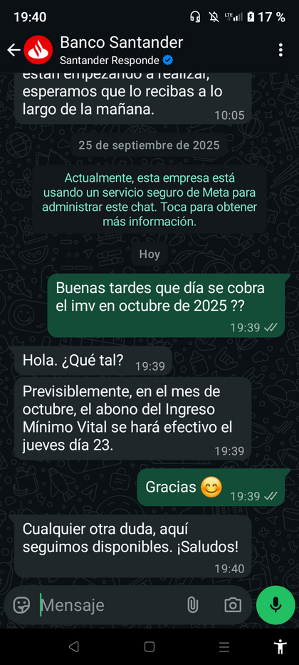Pues ojalá sea verdad y lo tengamos para el 23, pero vaya que el WhatsApp del Santander suele fallar más que una escopeta de feria xD