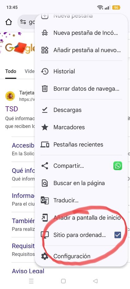 Si entras por el móvil a la página web de la TSD tienes que marcar sitio para ordenador en el navegador.