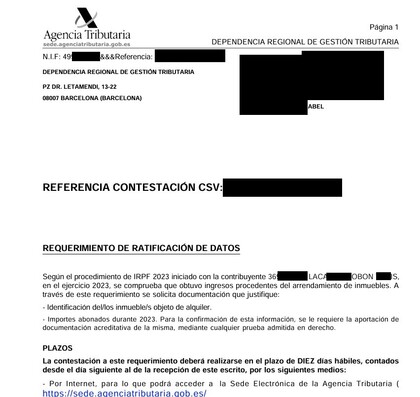 REQUERIMIENTO DE RATIFICACIÓN DE DATOS Según el procedimiento de IRPF 2023 iniciado con la contribuyente 36 HAIS, en el ejercicio 2023, se comprueba que obtuvo ingresos procedentes del arrendamiento de inmuebles. A través de este requerimiento se solicita documentación que justifique:- Identificación del/los inmueble/s objeto de alquiler.- Importes abonados durante 2023. Para la confirmación de esta información, se le requiere la aportación de documentación acreditativa de la misma, mediante cualquier prueba admitida en derecho. PLAZOS La contestación a este requerimiento deberá realizarse en el plazo de DIEZ días hábiles, contados desde el día siguiente al de la recepción de este escrito, por los siguientes medios: