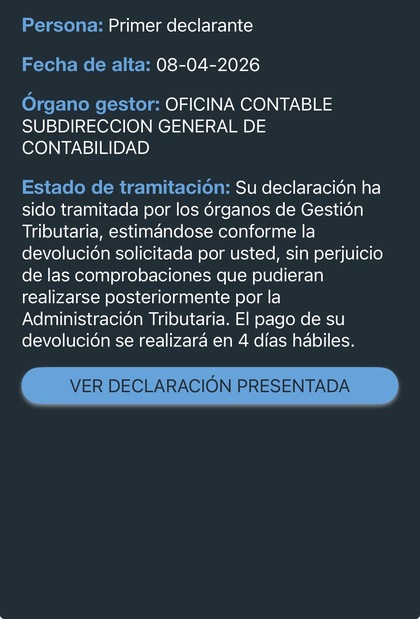 Declaración presentada a devolver 429 euros en Santa Cruz de Tenerife. Resuelta aprobada. Súper rápido. Presentada ayer. Me cambio a dev eso que significa