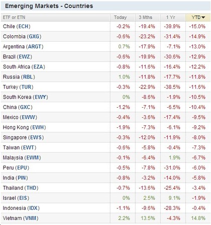 Con apenas escasos 30 días de negociación en este año 2014, este es el panorama visto desde la perspectiva de ETFs Por aquí los ETFs no son muy populares , pero para el caso presente nos pueden servir de orientación. En los ETFs regionales puede haber diferencias importantes con la gestión activa. Qué se salva? Mineras,Oro, Plata,Bonos y REITs US,este sector castigado en el último semestre del 2013 por el temor a la subida de tipos ahora se beneficia de la bajada de rentabilidad del bono.