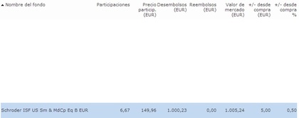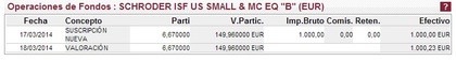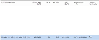 Hola a todos. Os comento una cuestión que me pone nervioso en Renta 4. Acabo de empezar con ellos y no lo entiendo. ¿Alguien me puede comentar esta tabla? ¿Cómo pueden aparecer el mismo VL un día y otro y en un caso tener ya ingresados 23 centimos si según la tabla el VL permanece inalterado? Para este fondo, en Morningstar, he colocado los siguientes datos. He suscrito en teoría 1000 euros pero sin embargo me aparece que he suscrito 1000.23 euros. ¿Por qué? 1000.23 debería ser el valor de mercado. Agradezco que me orientéis por favor. Estas cosas me ponen nervioso. A través de estas capturas espero que os situéis. Gracias.
