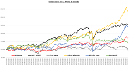 Siguen liderando el reto el Cobas selección con una rentabilidad del 36,299% y el MSCI World con un 33,797%, el Fundsmith con estos dos últimos meses tan malos que lleva se ha descolgado mucho de los puestos de cabeza y se viene a la mitad de la tabla con una revalorización acumulada del 15,042%. La cartera Mikelone, poco a poco, sin prisas y con una volatilidad controlada, sigue acortando distancia con las carteras que llevamos por delante y presentamos una rentabilidad acumulada del 13,773%. De vagones de cola y cerrando la clasificación están el AZvalor Internacional con una rentabilidad acumulada en más de dos años del 0,49% y el último de todos el True Value con una rentabilidad del -0,772%.